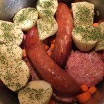 - Ajouter les carottes, les viandes et les pommes de terre. Parsemer de persil.