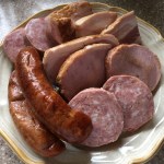 - 1 kg (2,2 lbs) de viandes à choucroute (côtelettes de porc fumées ou fraîches, bacon ou poitrine fumée de porc, jambon, saucisson de Morteau et/ou à l’ail, knackwurst, etc.)