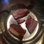 - Allumer l’autocuiseur en mode « Sauté » ou mettre le pot sur le rond (s’il est en acier!), et faire dorer dans l’huile d’abord le bacon ou la poitrine fumée, puis les côtelettes, 2 ou 3 minutes de chaque côté. Retirer la viande et la réserver.