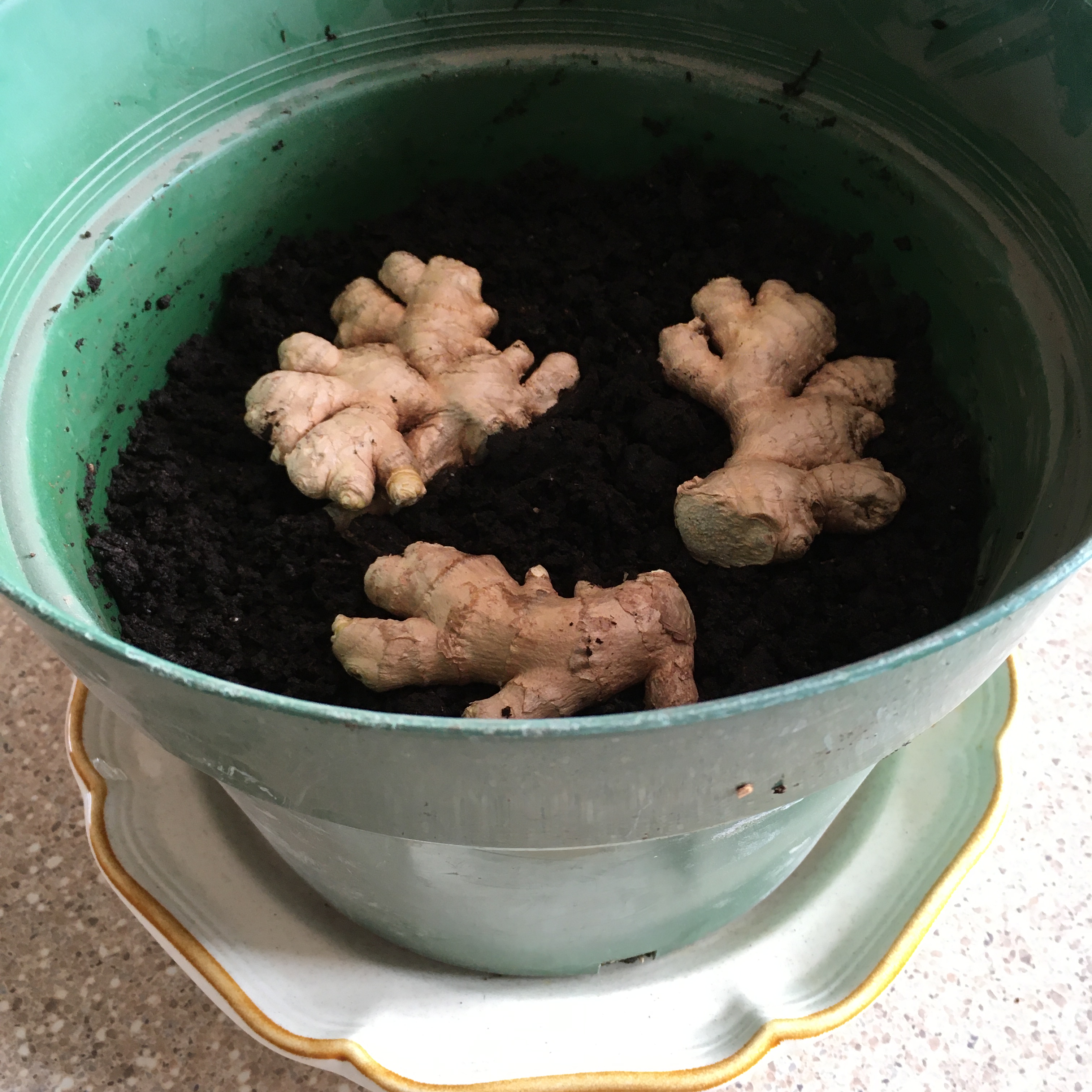 Au début mars, acheter de beaux rhizomes de gingembre frais, bien fermes et non abîmés, bios ou qui commencent à bourgeonner. Les bourgeons, ou « yeux » (les petites pointes beiges ou vert pâle) sont la preuve que les racines n’ont pas été irradiées pour les rendre stériles et les empêcher de germer.